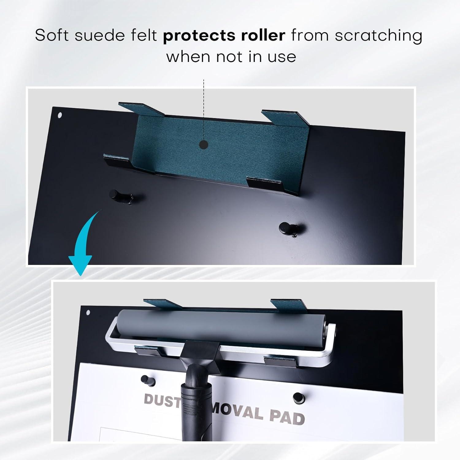 Roller & Mat Holding Board: Mat holder is made of aluminium material, there are silicone particles at all four corners to firmly fix the mat on the desktop without sliding, removes the silicone particles can hang the board on the wall for operation or storage.