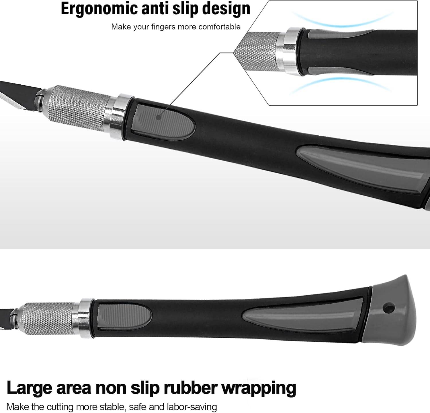 Ergonomic Hobby Knife: The heavy-duty knife handle is made of soft rubber and ABS plastic with a thick base for added grip & stability and an irregular shaped tail so it is not easy to roll off your desk. The pen shaped handle weighted for balance with both textured grip and anti-slip grip on a lower middle place, superior control allows you to make accurate, delicate cuts.